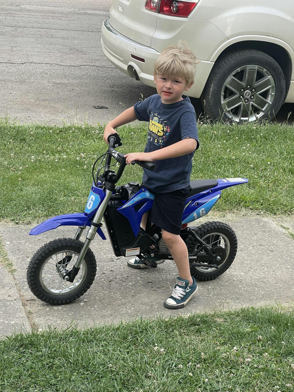 Electric motorcycle designed for kids aged 3-10 with authentic dirt bike geometry provides for a solid ride off-road with a max rider weight of 140 lbs.